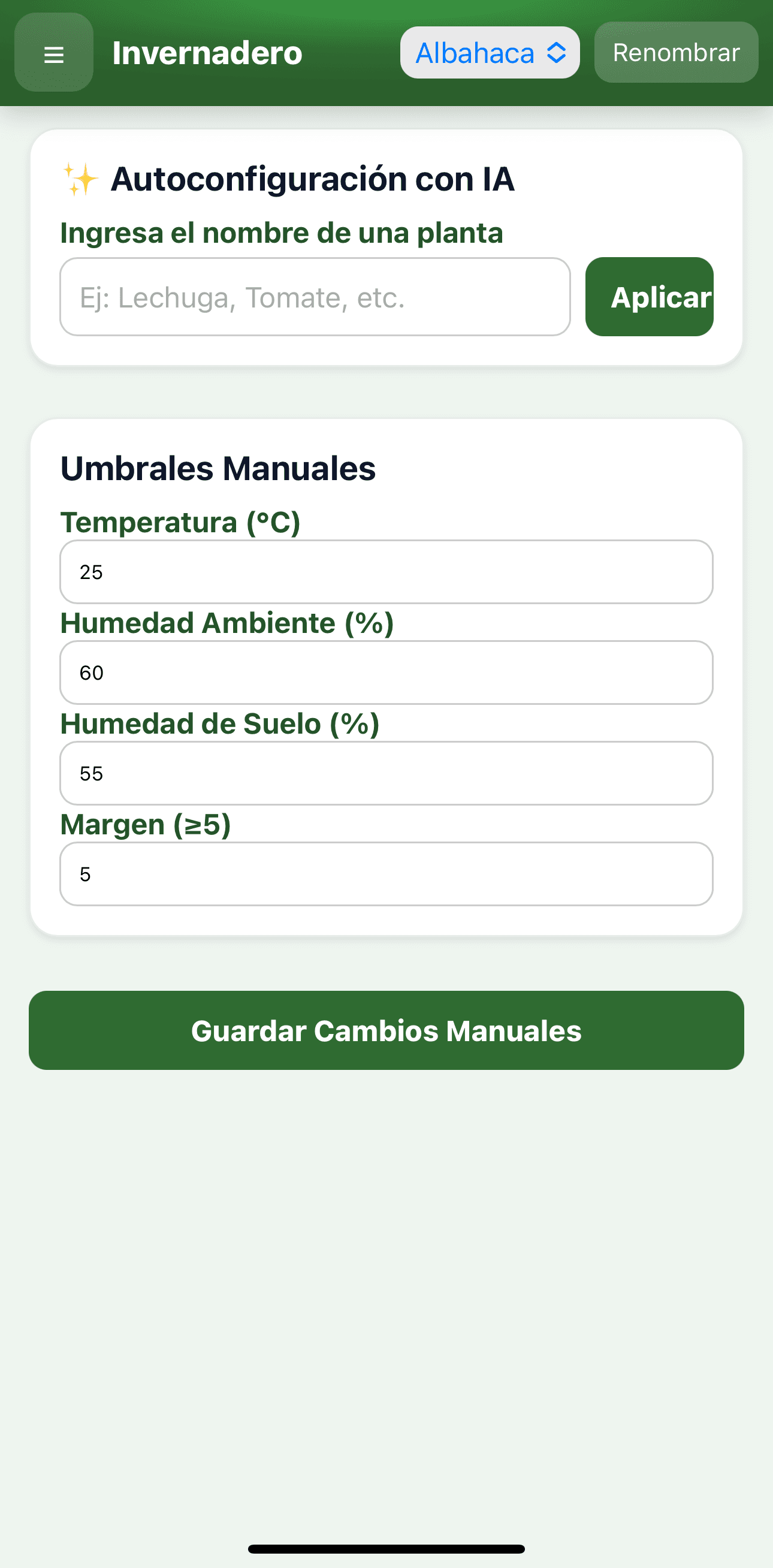 Dile qué cultivas y Grow Controller usará IA para consultar y aplicar los umbrales óptimos de temperatura y humedad de suelo.